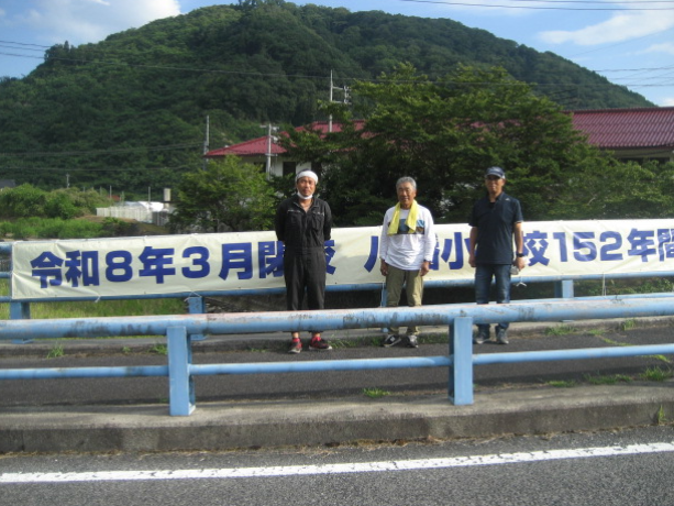 まず、地域の方々の意識向上のために、7月に「令和8年3月閉校 八幡小学校152年間 ありがとう」の横断幕を2対作成し、八幡小学校側の落合橋の欄干に設置しました。