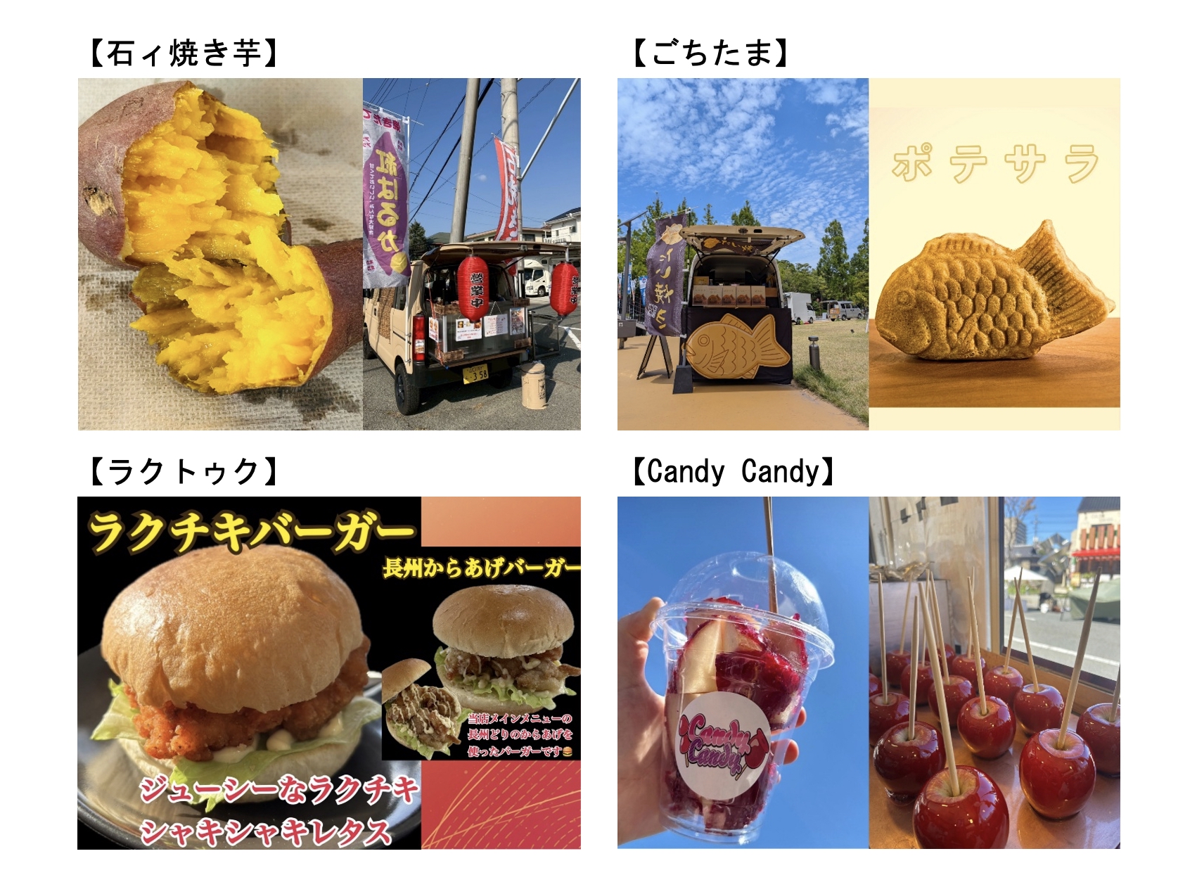 出店ラインナップは、ねっとり熟成された紅はるかの石焼き芋を販売してくださる「石ィ焼き芋」さん、寒い冬にぴったりのたいやきを販売してくださる「ごちたま」さん、ボリューム満点のハンバーガー等の軽食を販売してくださる「ラクトゥク」さん、見た目も可愛いフルーツ飴を販売してくださる「Candy Candy」さんです。もう1店舗は、当日をお楽しみに!